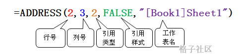 =ADDRESS(2,3,2,FALSE) 结果为R2C[3],即得出第2行第3列的单元格地址,并用R1C1样式展示