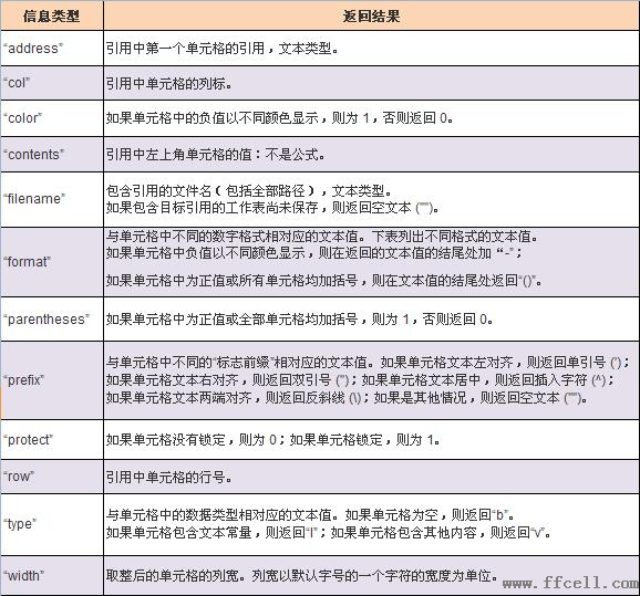 1. 信息类型:一个文本值,指定所需要的单元格信息的类型