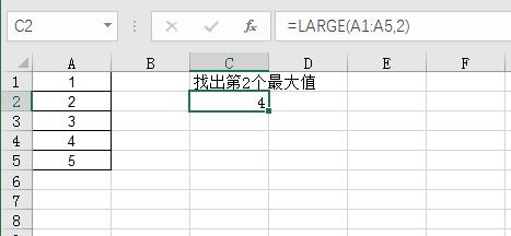 =LARGE(A1:A5,2) 结果为4,即在数据区域A1:A5中,找出第2个最大值,请看下面动画