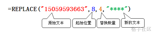 =Replace(A1,8,4,"****") 结果为1505959****。其中A1单元格的内容为15059593663