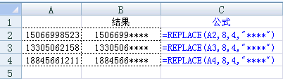 =Replace("15059593663",8,4,"****") 结果为1505959****