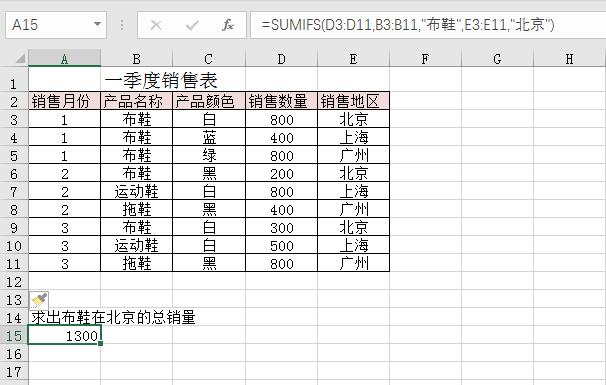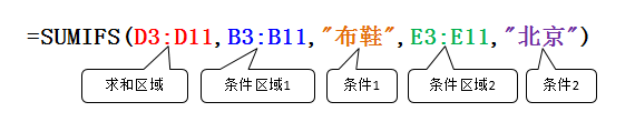 SumIfs(求和区域,条件区域1,条件1,条件区域2,条件2,...)