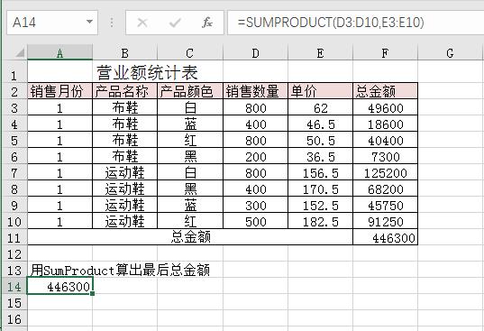=SUMPRODUCT(D3:D10,E3:E10)结果将求出1月份的总营业额,请看下面的例子。