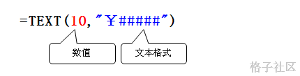 =TEXT(A1,"¥#####") 结果为¥10, 其中A1单元格的内容为数值10