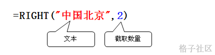 =Right("中国人",2) 结果为国人=Right(A1,2) 结果为国人, 其中A1单元格的内容为中国人