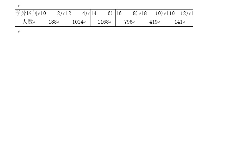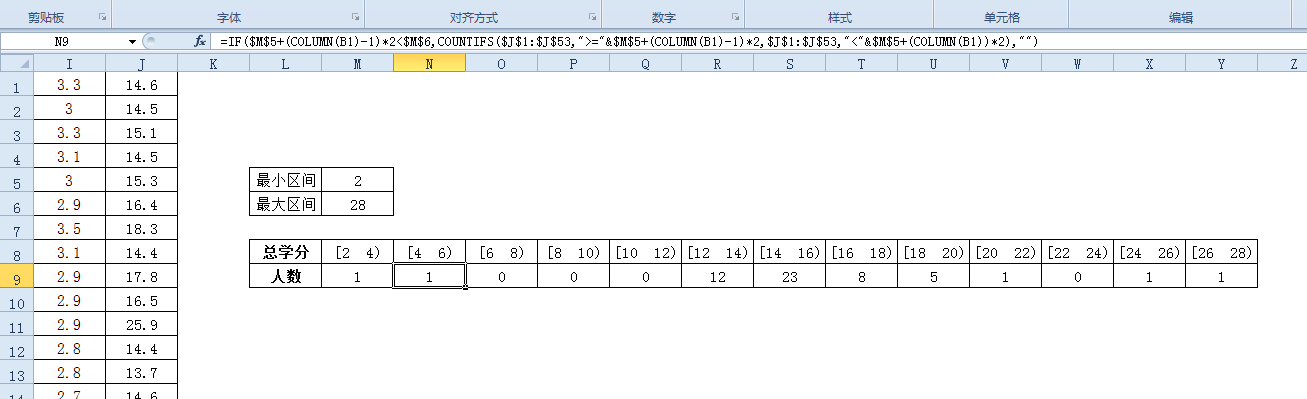 如图,如何把工作表中的总学分,分成组距为2的的若干区间(例如:[0,2)[2,4)。。。。),分别统计出总学分落在对应区间里的人数