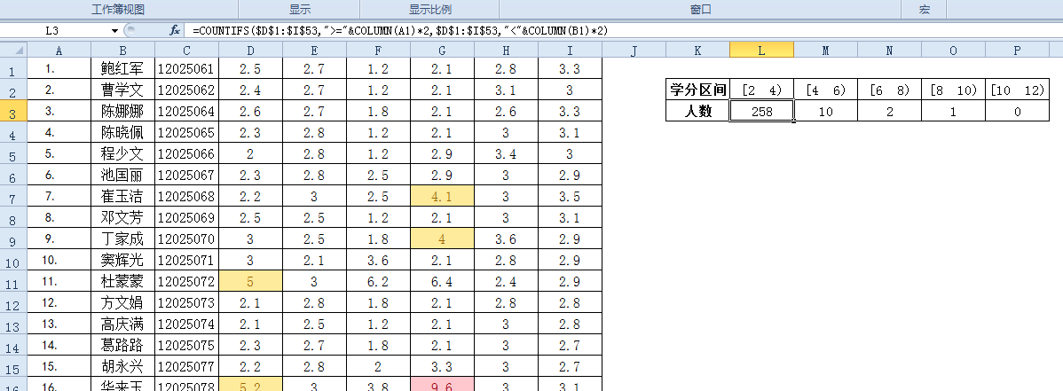 你好,可能理解错我的意思了??区间是按总学分那一列来分的(就是图中的I列)~麻烦在看一下