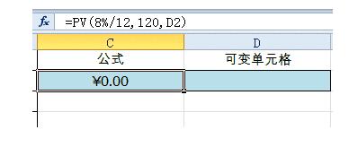 首先在C2单元格中写入以下公式:=PV(8%/12,120,D2)