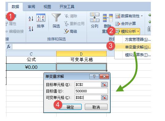 依次单击【数据】→【模拟分析】→【单变量求解】。