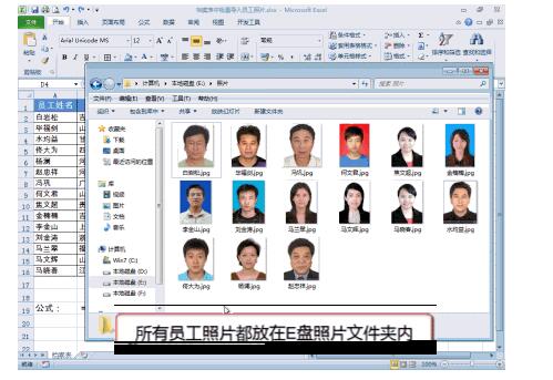 公式中的 E:照片 为存放照片的文件夹; A1 为照片名称单元格。