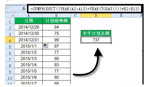 D4单元格用到的公式为:=SUMPRODUCT((YEAR(A2:A13)=YEAR(TODAY()))*B2:B13)
