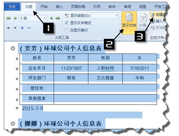 此时即可生成一个名为“信函1”的Word文档。在【大纲】视图下,按Ctrl+A全选内容,按下图设置,创建子文档: