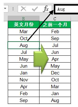 大致说说题目的意思:B列是英文简写的月份,需要计算之前一个月的月份,并且结果同样为英文月份,效果如C列所示。