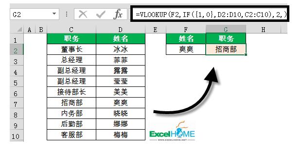 上图中,C:D是数据源,需要根据F2单元格指定的姓名查询对应的职务。G2单元格的公式为: