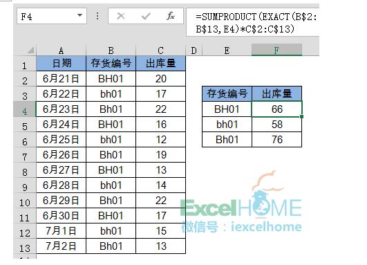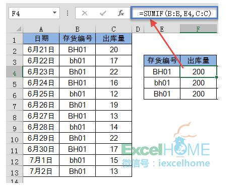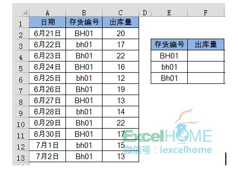 要求根据E列的存货编号,在F列汇总每种存货的出库总数。