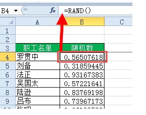 在Excel中制作随机抽奖的效果,核心是生成一组随机不重复值。首先,在B4输入以下公式,向下复制至B53: