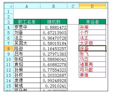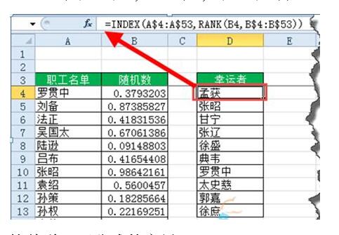 注意,抽奖结果生成后不能再进行编辑公式或是双击等激发重新计算的动作,否则抽奖结果会发生变化。