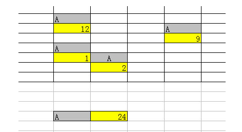 例2 如下图中,是一些不规则的数据,我们只关注填充颜色的区域,现在我们要计算所有A下面数字之和,看上去这个题没有好的思路,其实这个题恰好可以用SUMIF函数轻松解决。