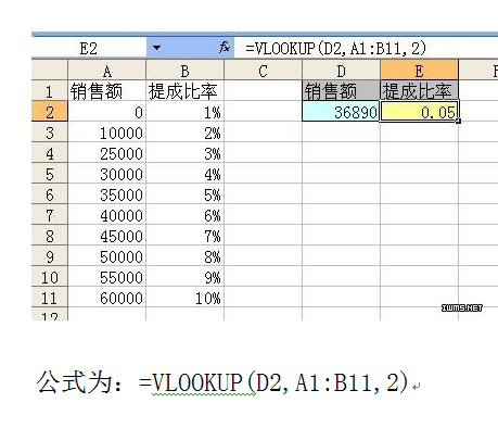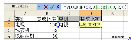 =VLOOKUP(C2,{"销售额","提成比率";"电视",0.1;"洗衣机",0.05;"吸油烟机",0.06},2,0)