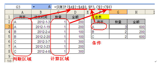 $A$2:$A$8是判断区域,拿F3的商家名称在这个区域进行判断是否相同,如果上同,就把C2:C8区域的金额进行求和。