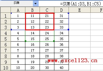 计算A1:D3和B1:C5两个区域中所有单元格数值的和。