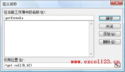 在“在当前工作簿中的名称”下输入一个名称,例如“getformula”,在“引用位置”下输入公式: