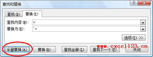 2.选择包含公式的单元格进行复制,然后粘贴到所需区域。接着按Ctrl+H打开“查找和替换”对话框,将“=”替换为“'=”,“'”为英文单引号,单击“全部替换”按钮。