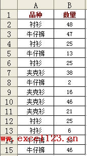 假如要查找的区域为A2:B15,要查询“衬衫”所对应的数值,并将查询结果放到一列中,在单元格中输入数组公式: