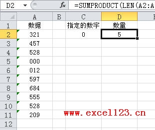 说明:先用SUBSTITUTE函数将区域各单元格中的指定数字“0”去掉,然后比较各单元格中文本数据的长度,最后将比较后的结果求和,即得到数字在区域中的出现次数。