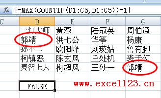 如果需要用公式来判断某个区域中是否包含重复值,可以用下面的数组公式。假如要判断的区域为D1:G5,在某个单元格中输入数组公式: