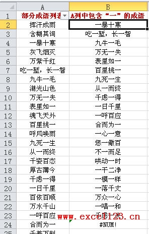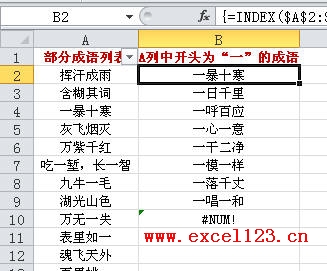 类似的,如果要从A列中提取开头为“一”字的成语,可用LEFT函数: