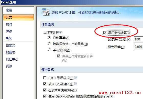 单击“Office按钮→Excel 选项→公式”,在“计算选项”区域中,勾选“启用迭代计算”选项。