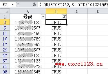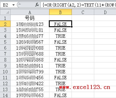 公式输入完毕按Ctrl+Shift+Enter结束,然后向下填充公式。这样,A列中凡是结尾两个数字相同的手机号,在B列中都显示为“TRUE”。