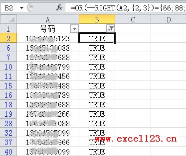 如果其中包含“TRUE”(即手机号的尾数为指定号码之一),则OR函数返回“TRUE”,否则返回“FALSE”。