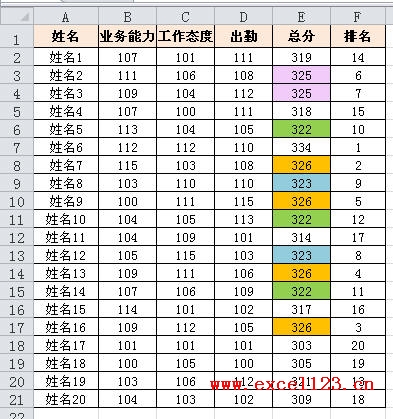 另外,如果用于排名的数值都为非负整数,可用“&”连接各列数值,再用SUMPRODUCT函数排名。如下图A1:E21区域为某公司年终考核的数据,要求先按总分列降序排名,如果总分相同,则依次按“业务能力”和“工作态度”列降序排名。