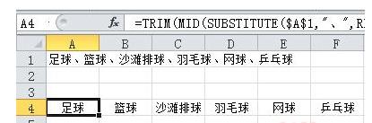 例如A1单元格中包含用顿号分割的文本“足球、篮球、沙滩排球、羽毛球、网球、乒乓球”,用下面的公式将顿号分隔的数据分列到一行中: