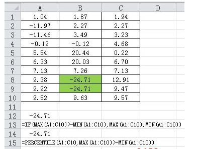 =PERCENTILE(A1:C10,MAX(A1:C10)>-MIN(A1:C10))