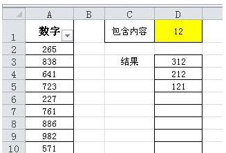 例如要查找A列包含“12”的数据,在D1中输入“12”即可。