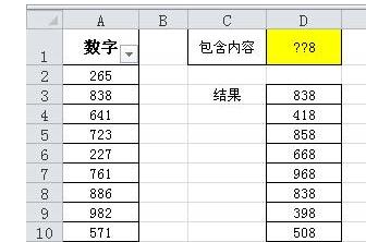 由于用到了SEARCH函数,因而可以支持通配符。如要返回A列中结尾为“8”的数字,只需在D1中输入“??8”。