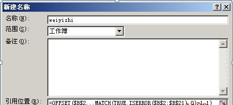 Excel 2003:单击菜单“插入→名称→定义”,弹出“定义名称”对话框,在“在当前工作簿中的名称”下的文本框中输入一个名称,如“weiyizhi”,在“引用位置”下输入上述公式,单击“确定”。