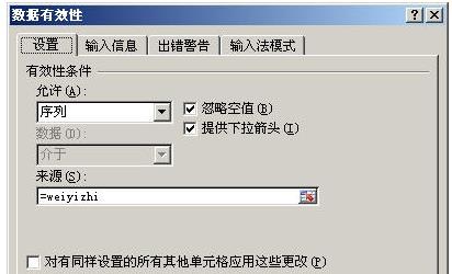 在弹出的“数据有效性”对话框中选择“设置”选项卡,在“允许”下选“序列”,在“来源”下的文本框中输入公式: