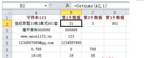 上述两个公式适合于字符串中包含连续数字的情况。但有时字符串中可能包含多个被文本分隔的数字,如“世纪家园31栋3单元901室”中就包含了3个数值,用上面的第二个公式只能返回第一个数值“31”,而第一个公式不能得到正确的结果。要分别提取字符串中的各个数值,可以用下面的自定义函数。