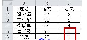 C2单元格输入公式:=SUMPRODUCT(($B$2:$B$6>=B2)/COUNTIF($B$2:$B$6,$B$2:$B$6)),下拉复制即可。