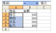 使用“指定”的方法可以大批量地进行名称定义。仍以图77-2所示的表格为例,如果需要把单元格区域A2∶A5定义名称为“姓名”,同时把单元格区域B2∶B5定义名称为“金额”,步骤如下。