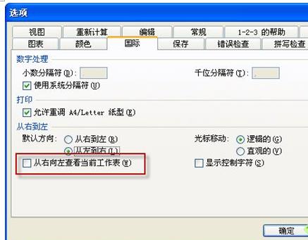 A:工具→选项→“国际”选项卡→去掉“从右向左查看当前工作表”的勾选。