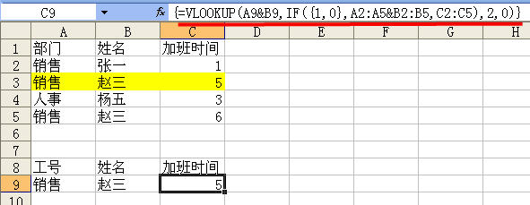 分析:我们可以延用例1的思路,我们的努力方向不是让VLOOKUP本身实现多条件查找,而是想办法重构一个数组。多个条件我们可以用&连接在一起,同样两列我们也可以连接成一列数据,然后用IF函数进行组合。公式:{=VLOOKUP(A9&B9,IF({1,0},A2:A5&B2:B5,C2:C5),2,0)}