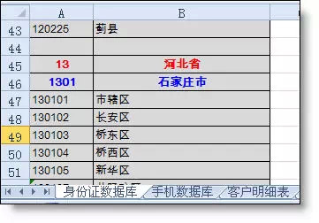 身份证的前2位代表省份,前4位代表具体的市,前6位代表具体的区县。为了提取具体信息,我们还需要一个身份证归属表(文后有下载地址),如下图所示。