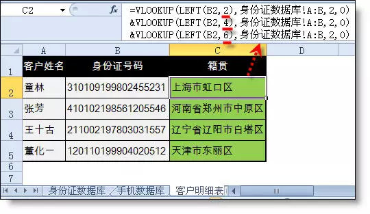 有了身份证数据库,在客户明细表中就可以用vlookup函数分别提取省、市和区,用&连接在一起构成归属地。公式:C2