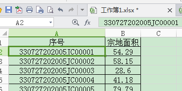 例如工作薄1中的序号330727202005JC00001面积54.29填到330727202005JC00001地籍