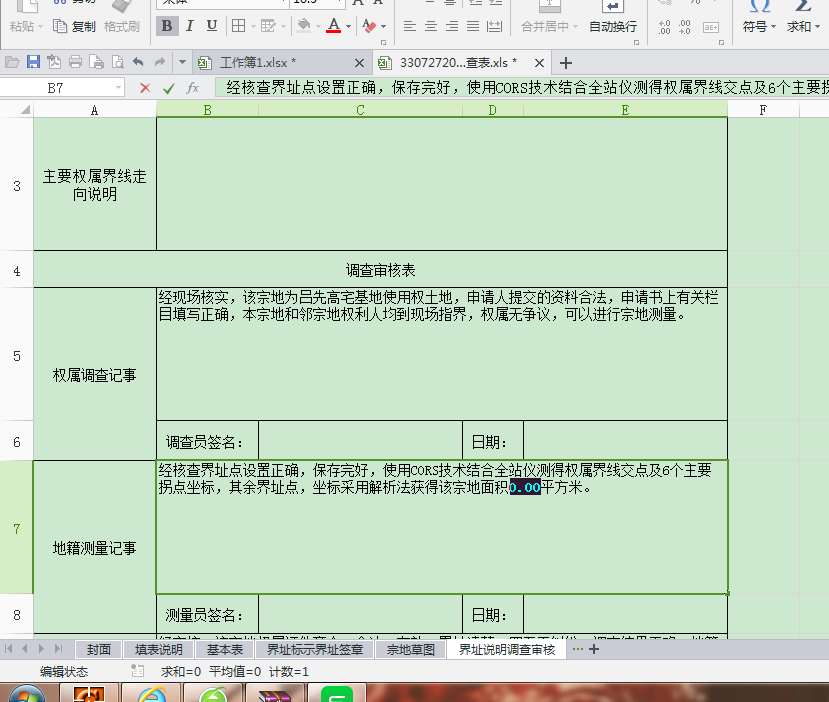 调查表中 ‘界址说明调查审核’ 的工作表的B7中宗地面积后面